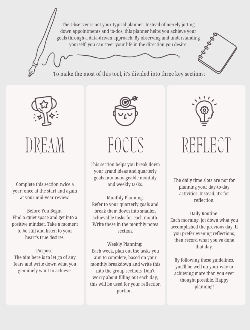- Focus Section: Break down your grand ideas and quarterly goals into manageable monthly and weekly tasks. This structured approach ensures you're always moving toward your objectives.